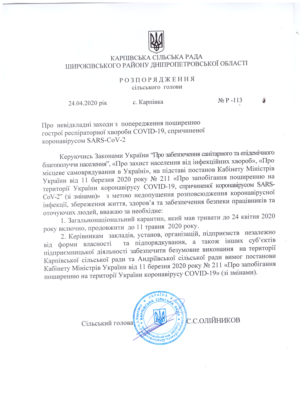В новинах нашого сайту згадувалося, що 22 квітня 2020 року Кабінетом Міністрів України було продовжено дії карантину до 11 травня 2020 року, тому на підставі цього Карпівською сільською радою прийнято розпорядження №Р-113 від 24.04.2020 року, з ким хочемо ознайомити громаду, місцеві заклади, організації та підприємства.