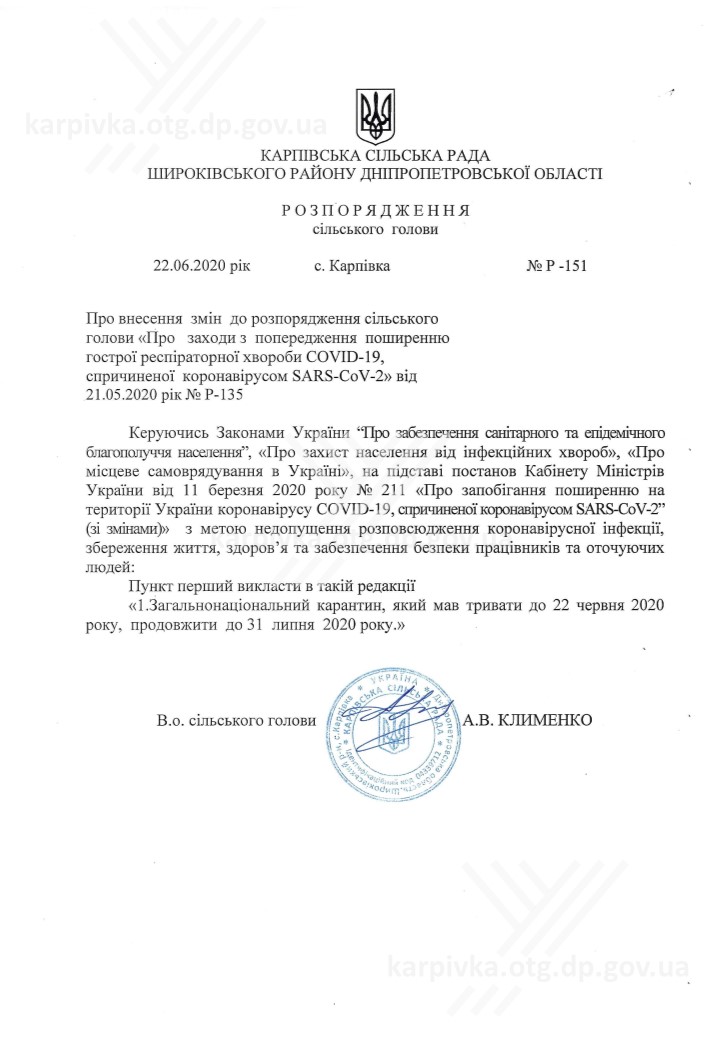 Джерело : https://karpivka.otg.dp.gov.ua/ua/novini-ta-podiyi/novini/prodovzhennya-karantinu-do-31072020-r?v=5ef45bf6f2b0f&fbclid=IwAR1FvV6GrqRrQf08SO6NNHlXMUphDxHRqNH99aMxlTVLs8vofk01dG7e8tM